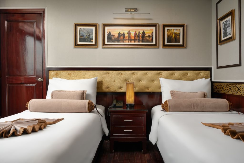 Swan is a metal boat which has 18 cabins decorated with oriental inspiration. It is the 3-star boat at a reasonable price among cruises in Bai Tu Long Bay. All the cabin are oriental-designed cabin with large windows. There are 3 cabins with balconies, family rooms with connecting doors, triple cabins. Certain cabin with Jacuzzi. On board the boat, there is an English-speaking guide.