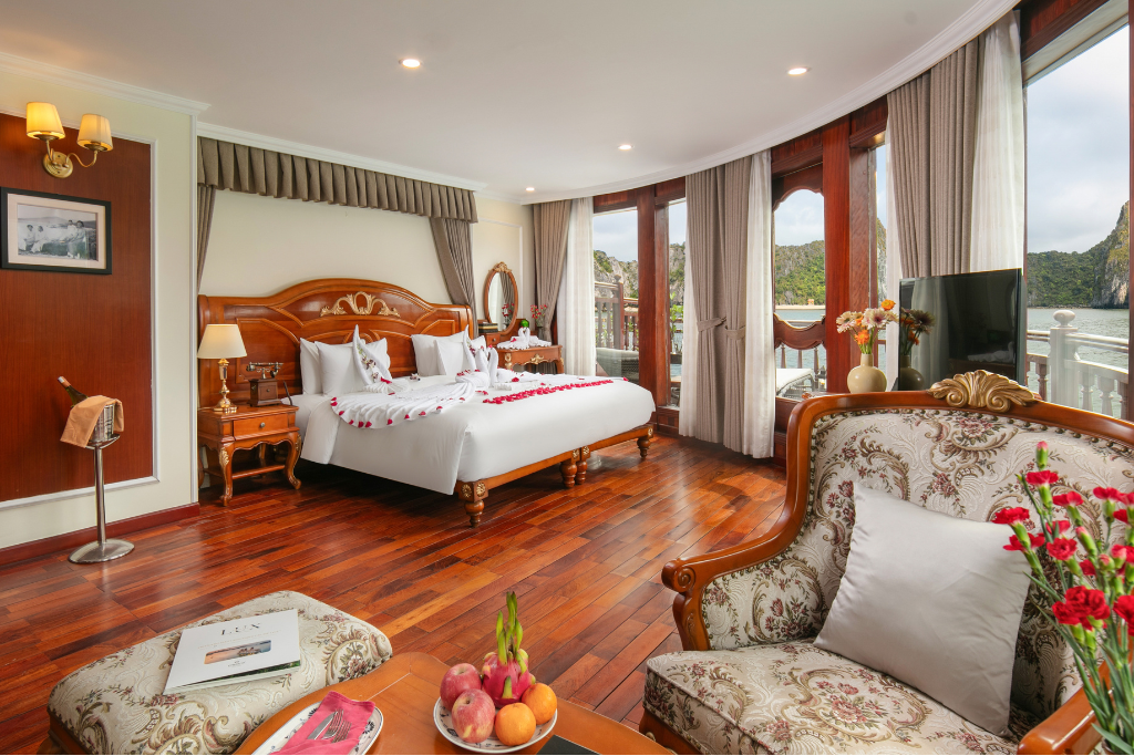 La croisière Emperor est un bateau luxueux de 10 cabines avec 3 ponts qui propose la croisière en Baie d’Halong. Inspirée par la vie somptueuse de l’Empereur de Bao Dai, le dernier roi du Vietnam, le bateau Emperor est conçu dans le style royal classique des années 1930 avec des équipements modernes. Chaque cabine dispose d’une histoire et d’un design spécifique en optimisant le confort et la lumière naturelle. Une grande terrasse au pont supérieur, deux bars, deux restaurants de luxe, une petite bibliothèque, une salle de sport, un coin pour enfants sont mis à votre disposition. Il y a le guide anglophone à bord du bateau. L’équipage est sympathique. Le wifi gratuit.