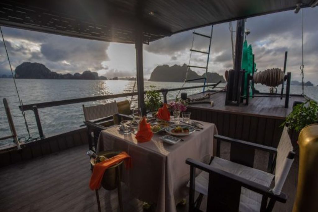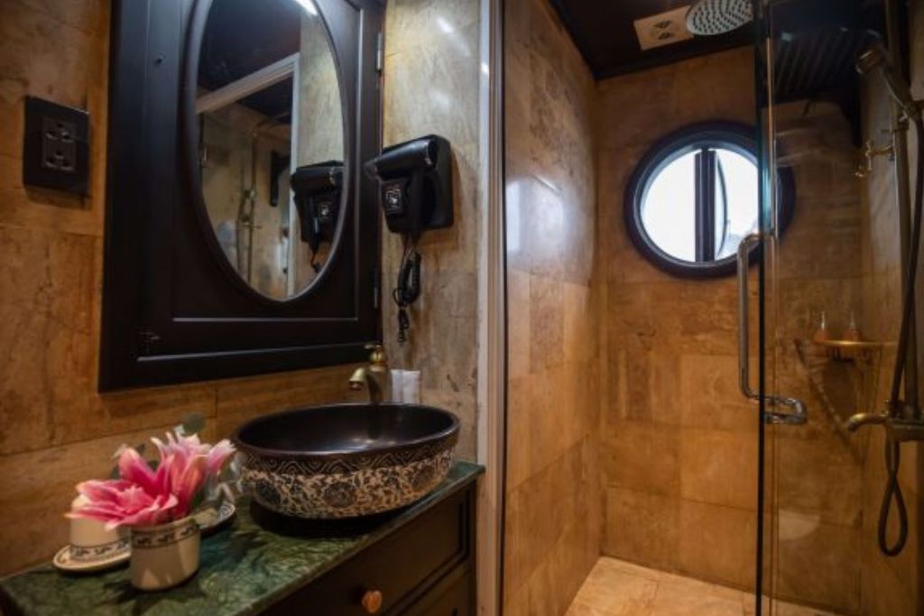 La croisière privée d’Amour une cabine est un bateau traditionnel en bois conçu avec sophistication avec 2 voiles. Cette jonque est décorée de façon traditionnelle avec une attention minutieuse à chaque détail. Il n’y a pas de lit d’appoint. Les cabines n’ont pas de balcon, par contre, vous pouvez admirer la baie de Bai Tu Long grâce à une grande fenêtre vitrée.