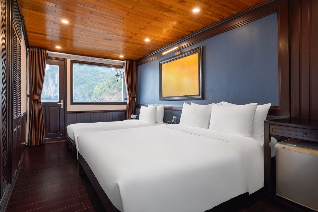 Le bateau possède un pont soleil qui offre une vue panoramique exceptionnelle sur les beaux paysages de la Baie de Bai Tu Long tout en dégustant un cocktail (Supplément). Des chaises longues et des tables sont à votre disposition. Il y a un bar sur ce pont de soleil.