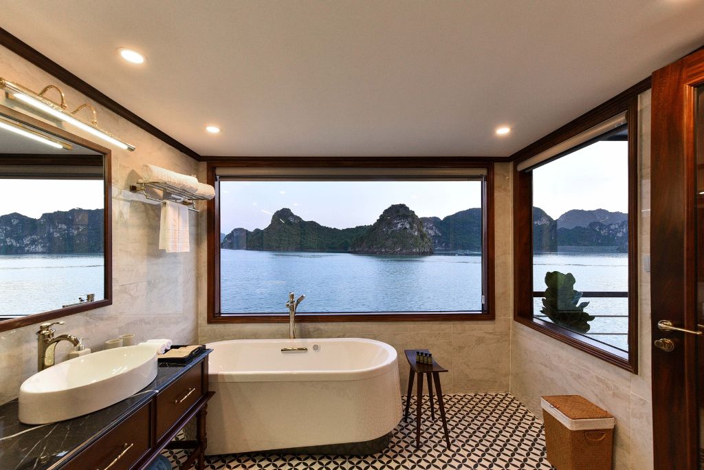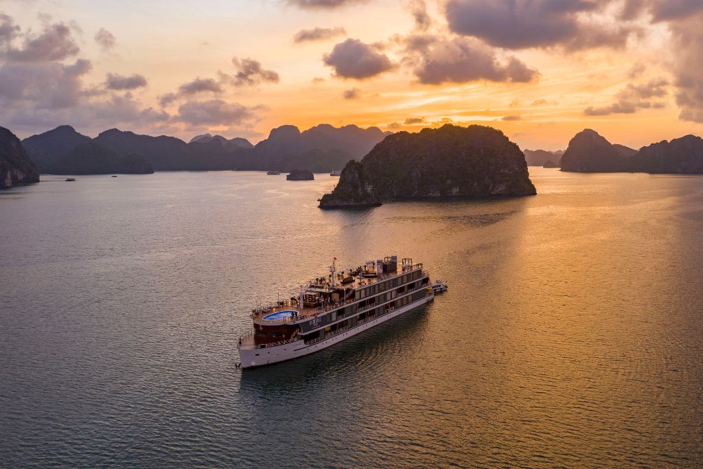 Heritage Cruise : luxe et art sur la baie de Lan Ha.Avec ses 20 cabines de style indochinois, ce bateau vous offre une expérience culturelle unique. Chaque cabine dispose d’un balcon privé et d’une baignoire pour un confort absolu.Profitez des installations haut de gamme à bord: une grande piscine, un salon piano, une galerie d’art et une terrasse spacieuse.Un guide anglophone et une équipe attentive sont à votre service. Le Wi-Fi est gratuit et un service de massage est disponible en supplément.