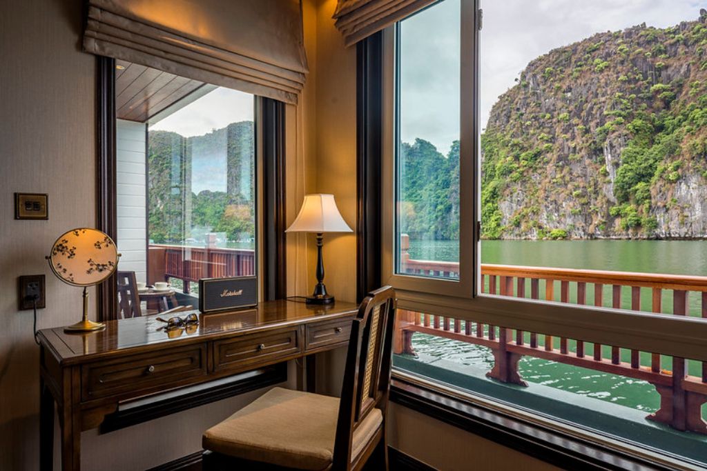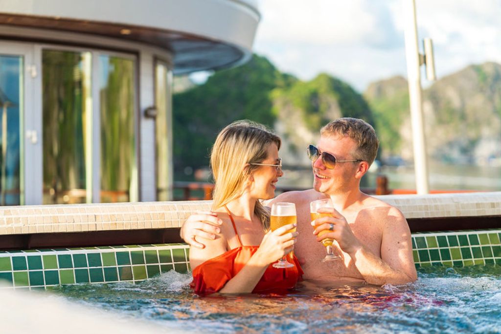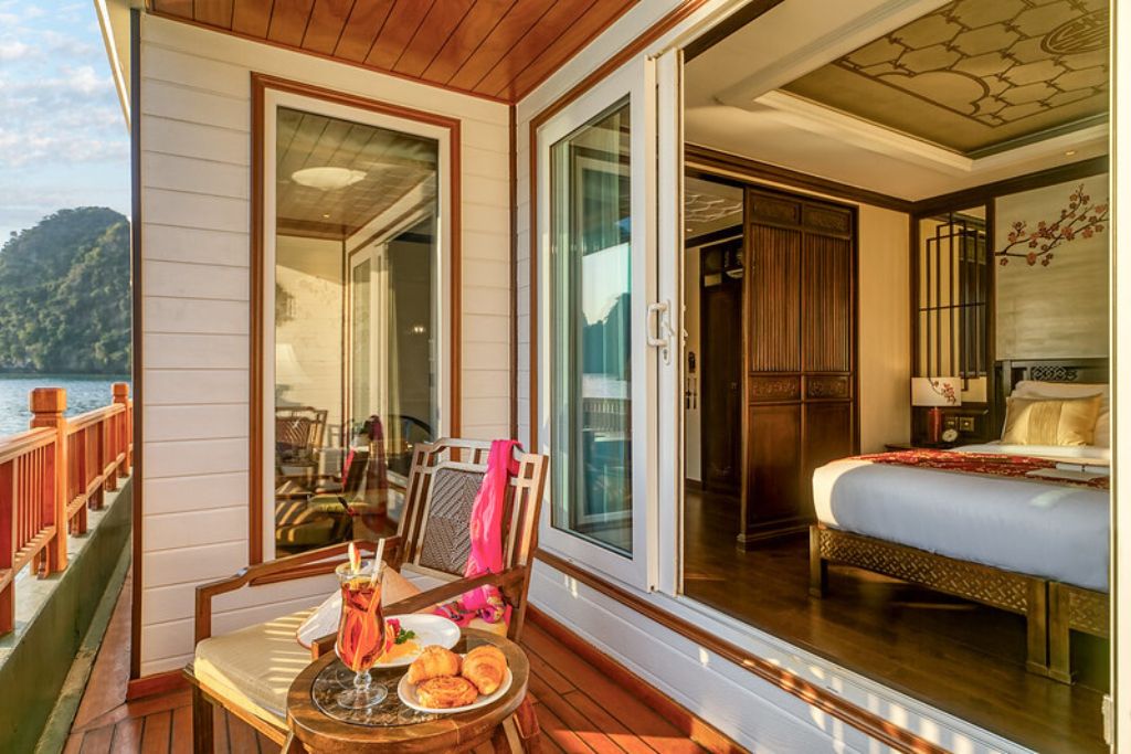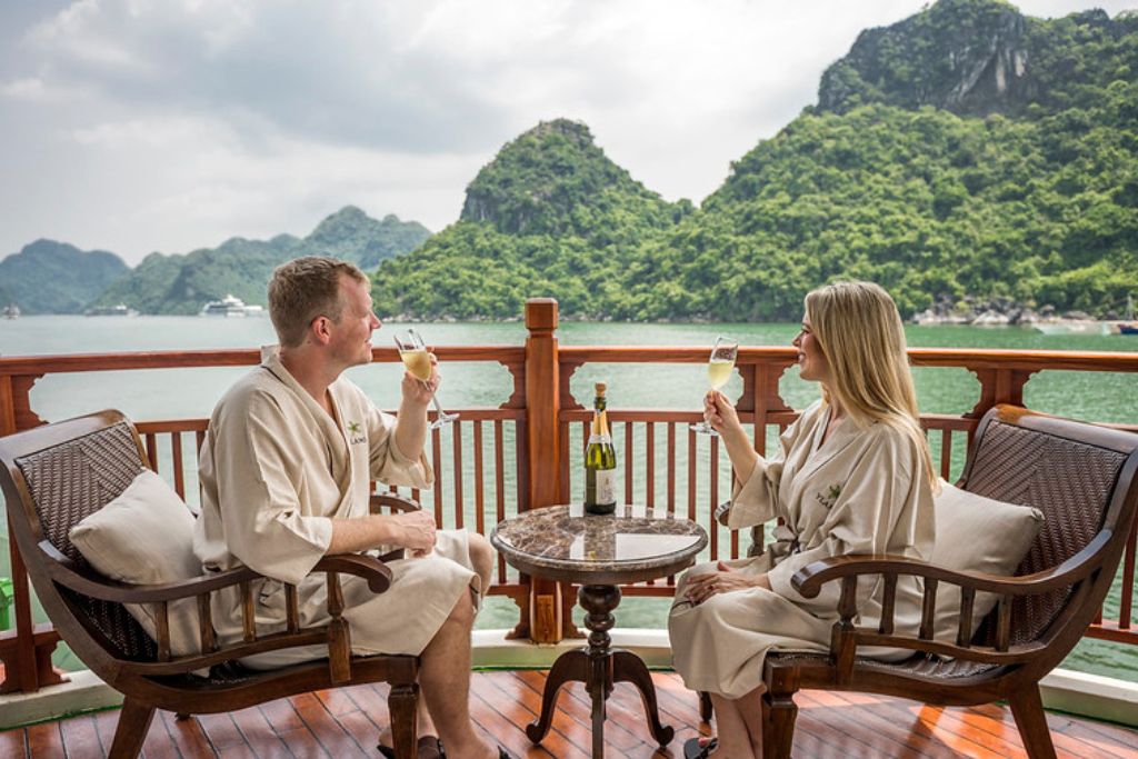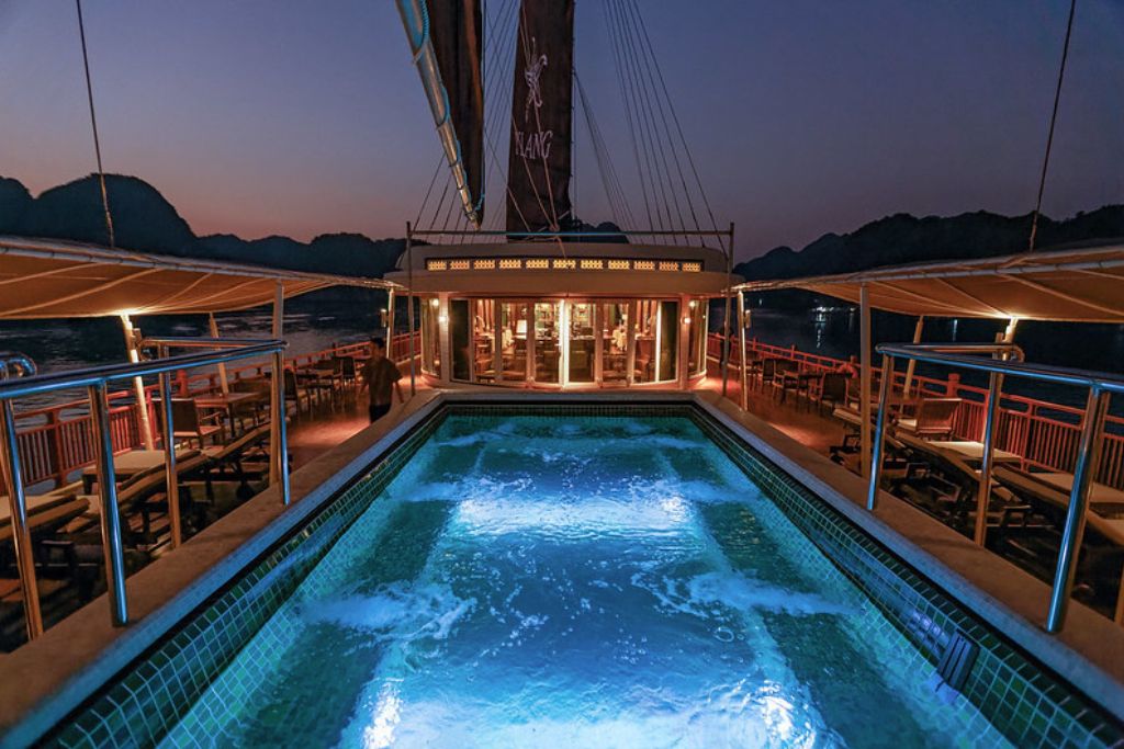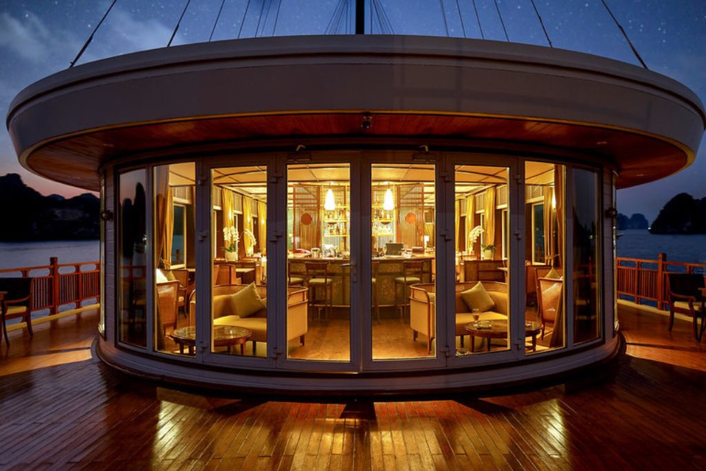 Le restaurant du bateau est un paradis culinaire où une gamme variée de plats vietnamiens frais est servie dans un somptueux restaurant doté d’une façade vitrée à presque 360 degré offrant aux convives une magnifique vue sur la Baie de Lan Ha. Les clients peuvent savourer la nourriture copieuse et sa cuite à la perfection tout en s’immergeant dans un paysage époustouflant.