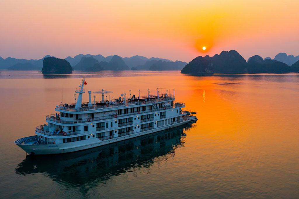 Un bateau de luxe 5 étoiles dans la baie d’Halong, offrant des services de bien-être haut de gamme : piano-bar, musique live, piscine jacuzzi, etc.