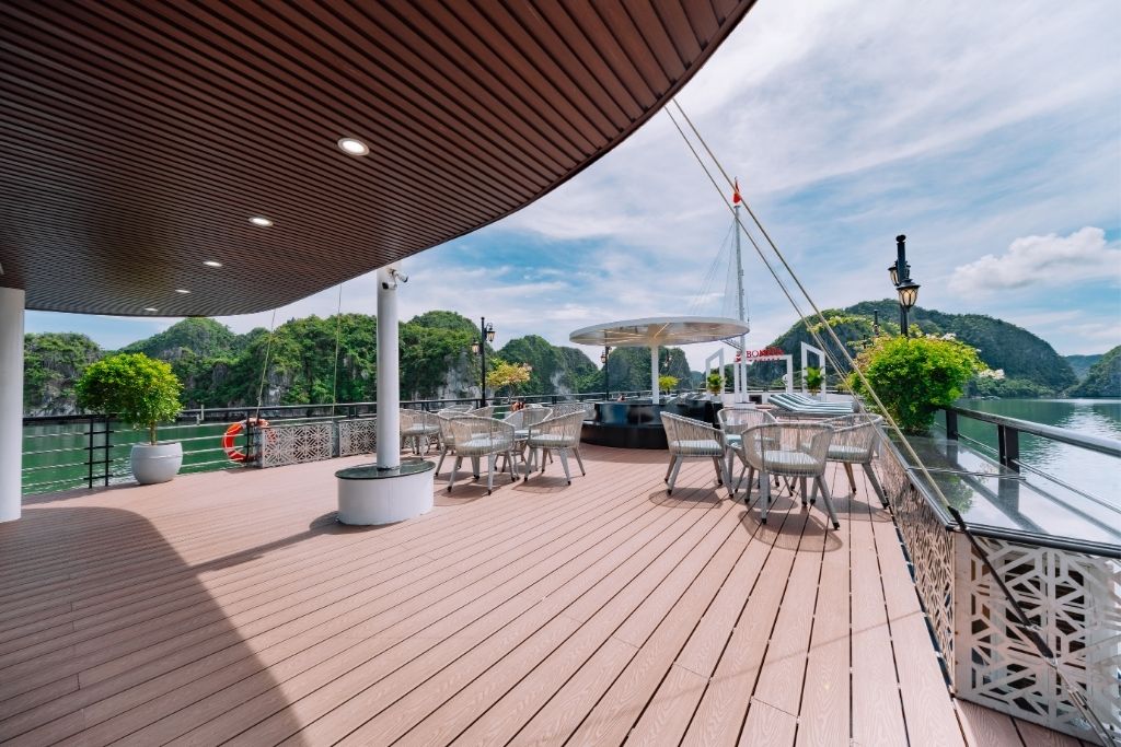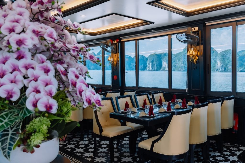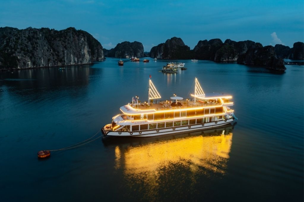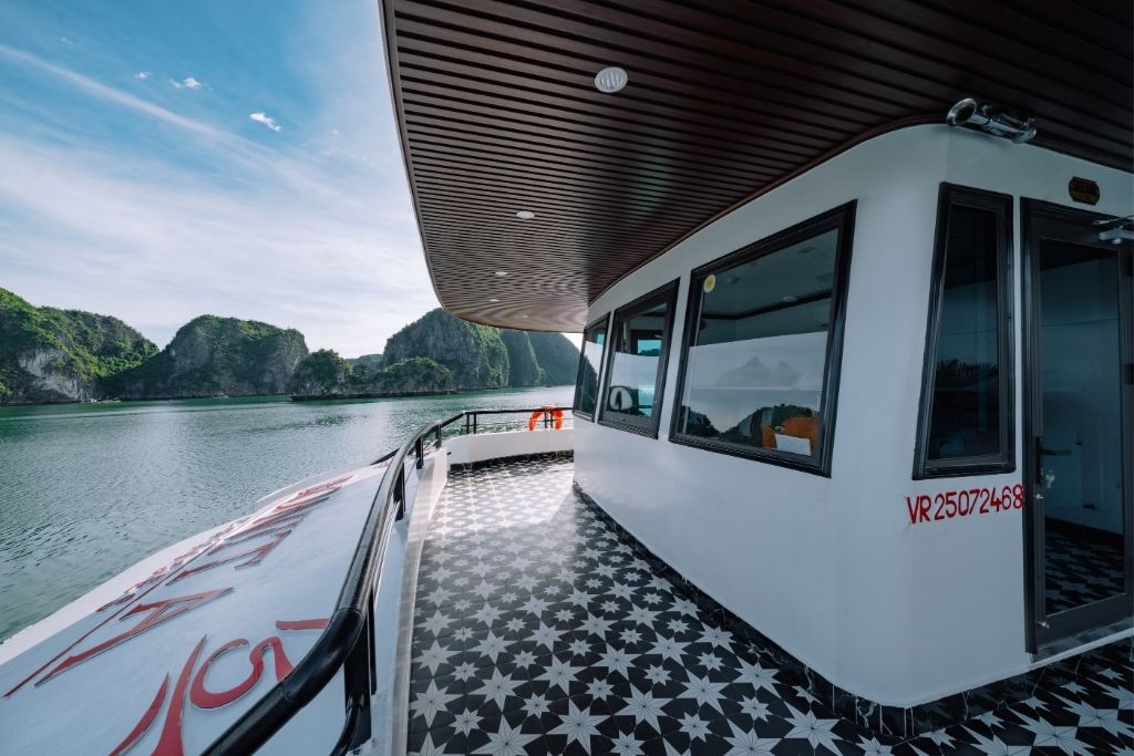 Nouveau bateau lancée en Septembre 2025. 10 cabins avec large fenêres. Bateau en acier qui navigue en Baie de Lan Ha à partir de l’île de Cat Ba.