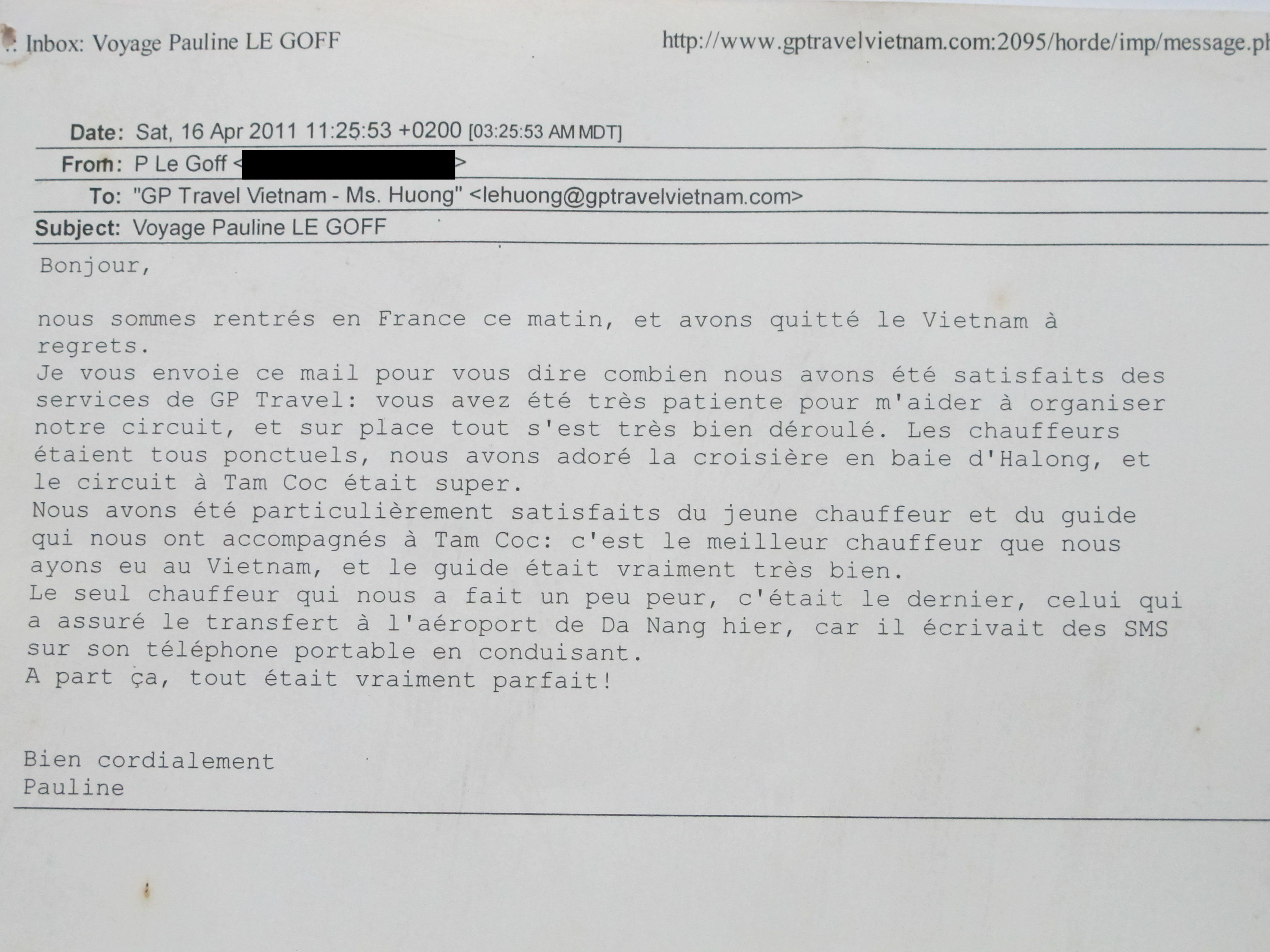 Je vous envoie ce mail pour vous dire combien nous avons été satisfaits des services de GP Travel : vous avez été très patiente pour m’aider à organiser notre circuit, et sur place tout s’est très bien déroulé. Les chauffeurs étaient tous ponctuels, nous avons adoré la croisière en baie d’Halong, et le circuit à Tam Coc était super.