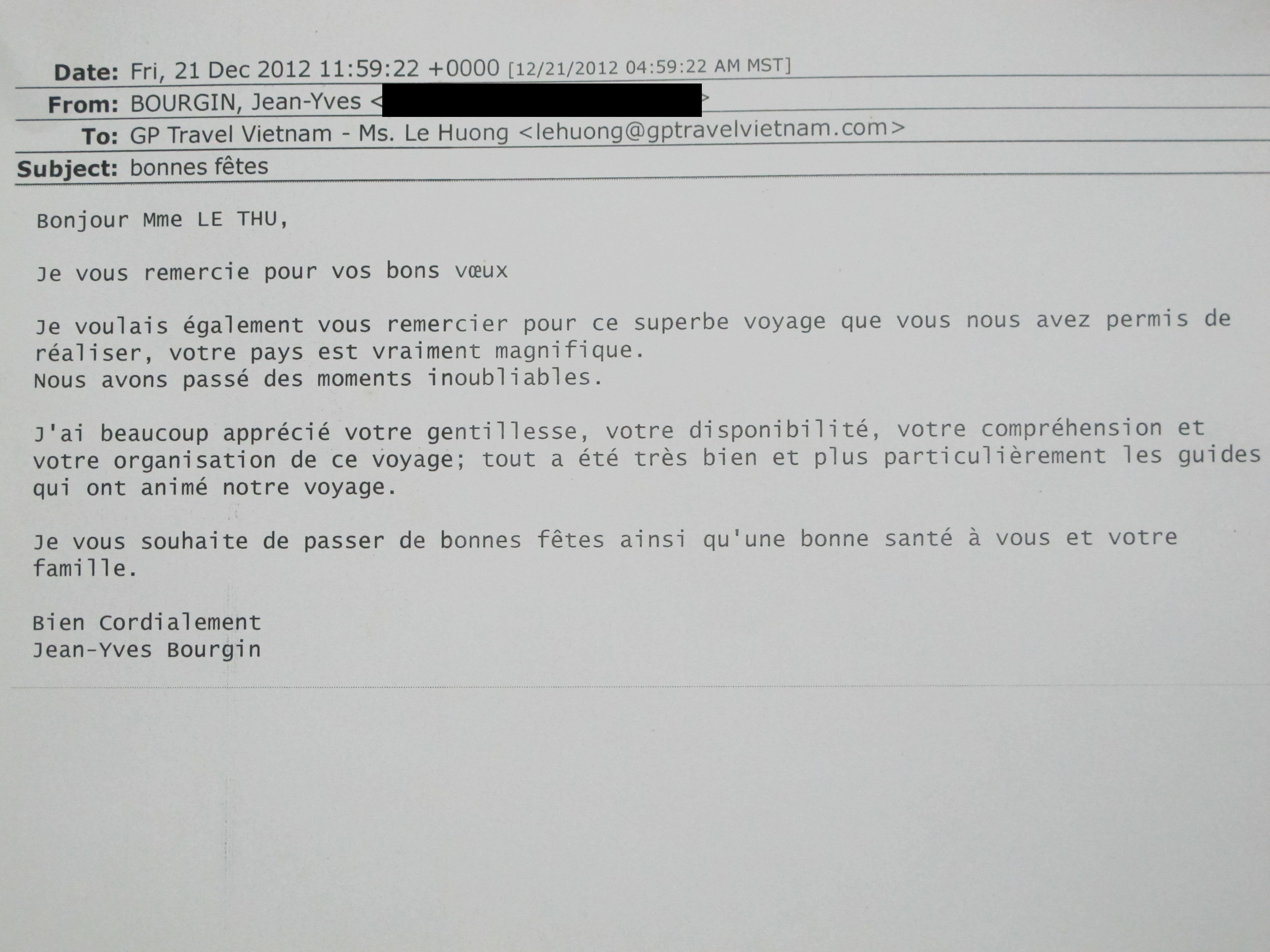 Je voulais également vous remercier pour ce superbe voyage que vous nous avez permis de réaliser, votre pays est vraiment magnifique.