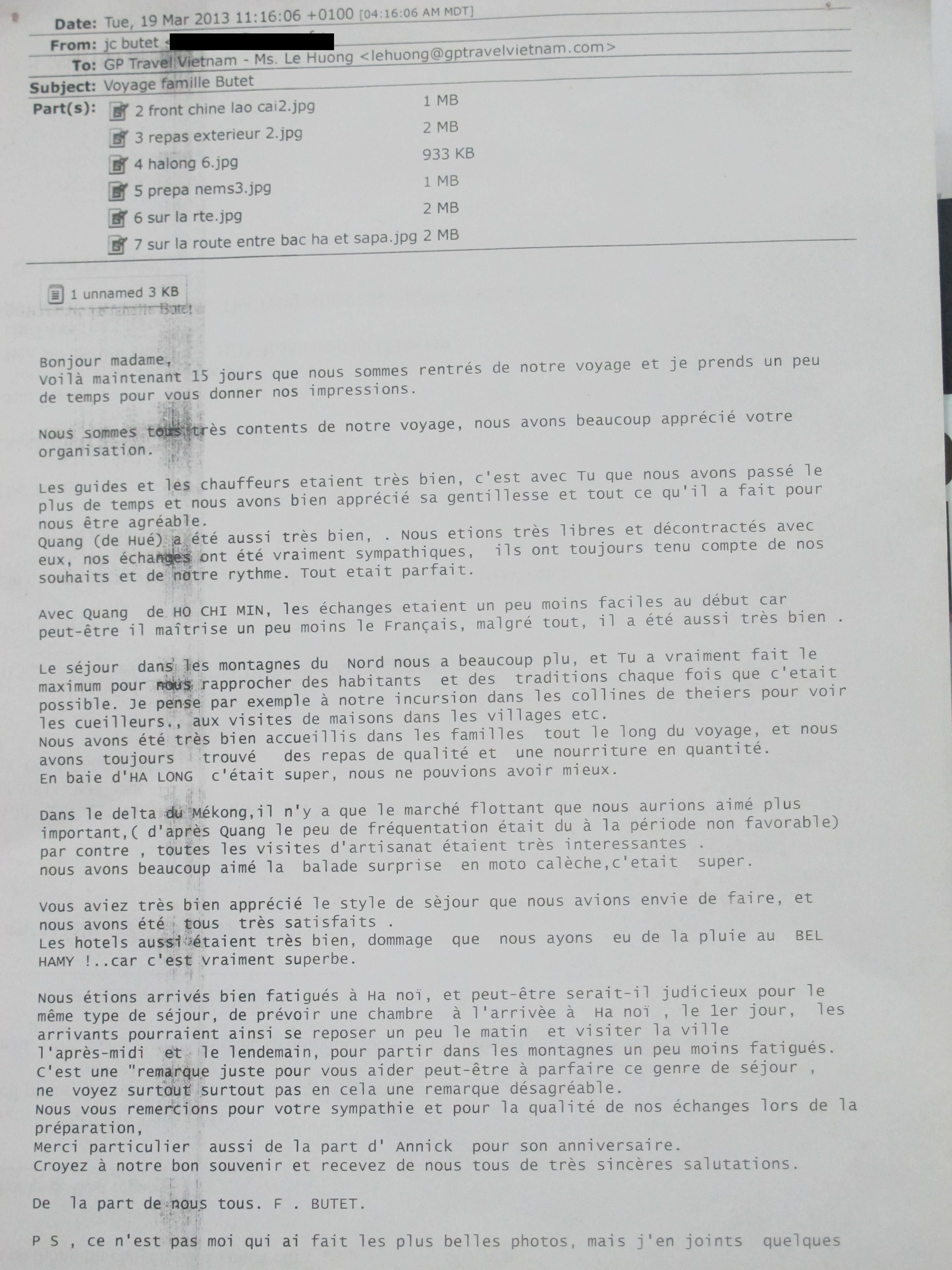 Nous étions arrivés bien fatigués à Ha noï, et peut-être serait-il judicieux pour le même type de séjour, de prévoir une chambre à l’arrivée à Ha noï, le 1er jour, les arrivants pourraient ainsi se reposer un peu le matin et visiter la ville l’après-midi et le lendemain, pour partir dans les montagnes un peu moins fatigués.
