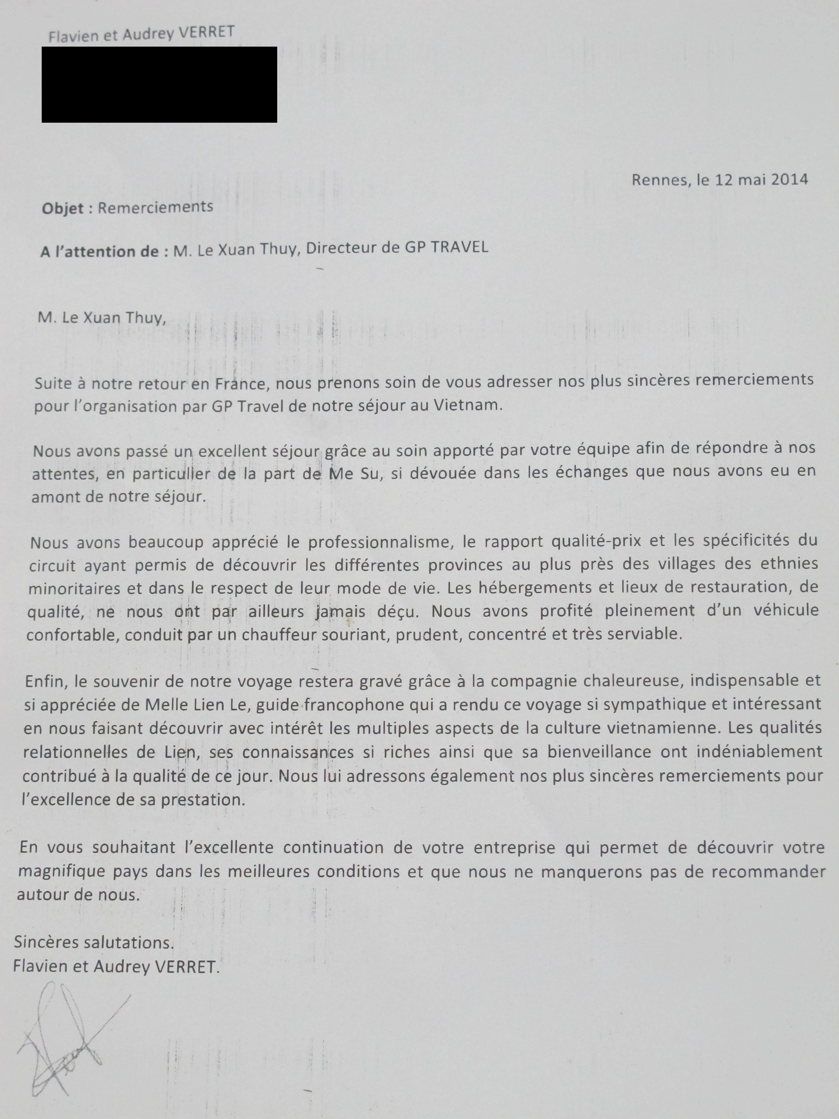 Suite à notre retour en France, nous prenons soin de vous adresser nos plus sincères remerciements pour l’organisation par GP Travel de notre séjour au Vietnam.