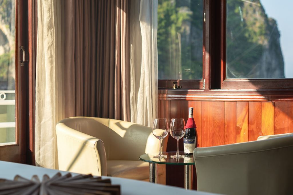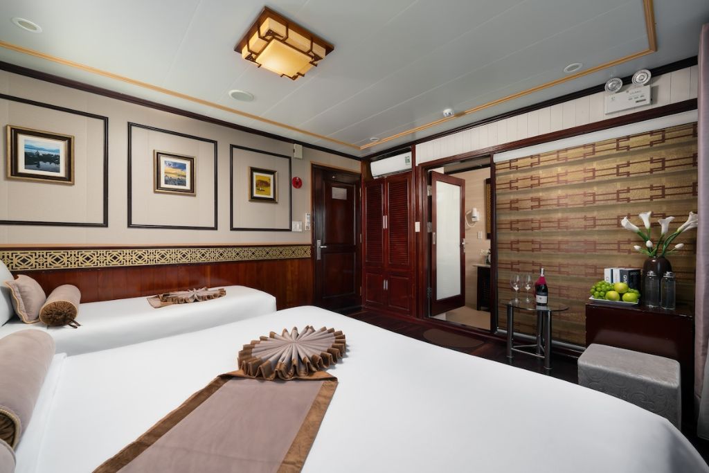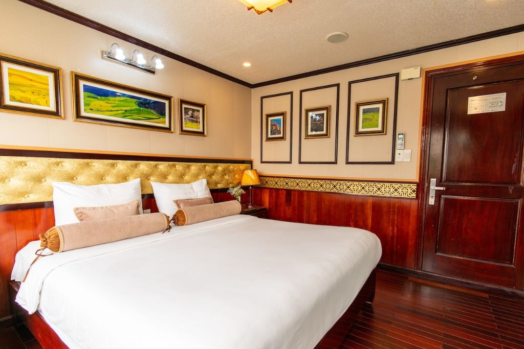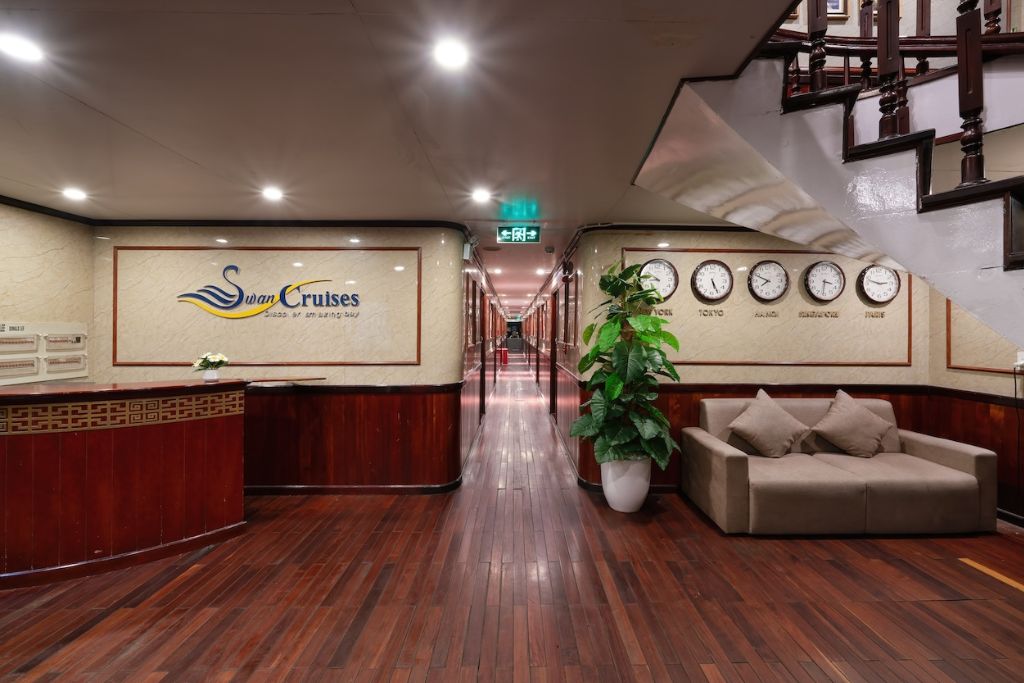 Swan is a metal boat which has 18 cabins decorated with oriental inspiration. It is the 3-star boat at a reasonable price among cruises in Bai Tu Long Bay. All the cabin are oriental-designed cabin with large windows. There are 3 cabins with balconies, family rooms with connecting doors, triple cabins. Certain cabin with Jacuzzi. On board the boat, there is an English-speaking guide.