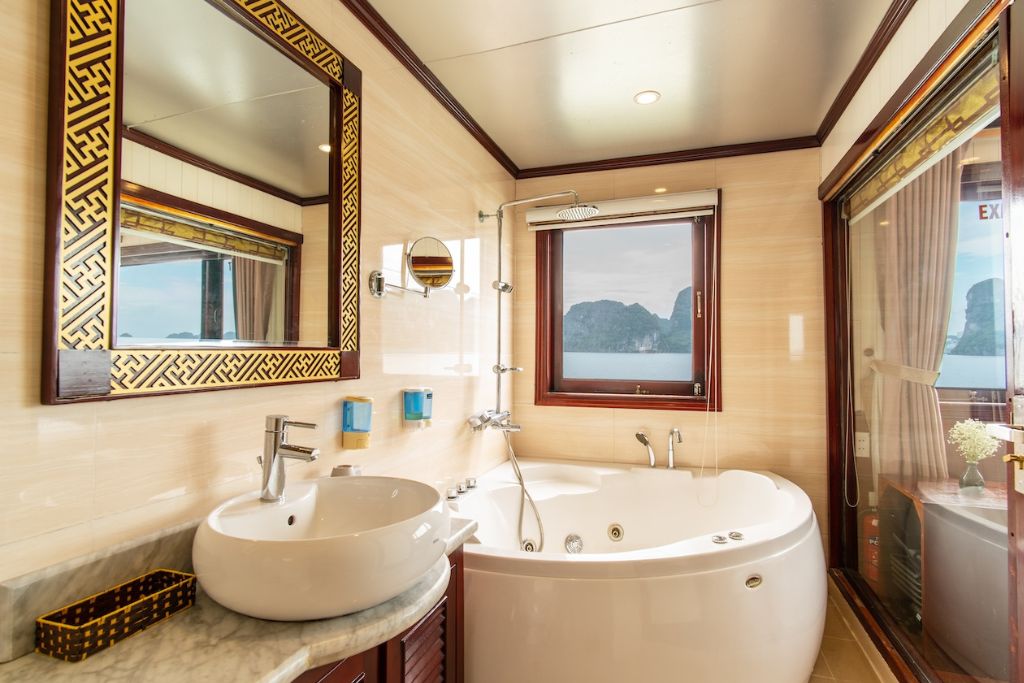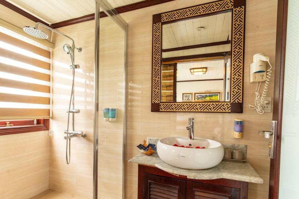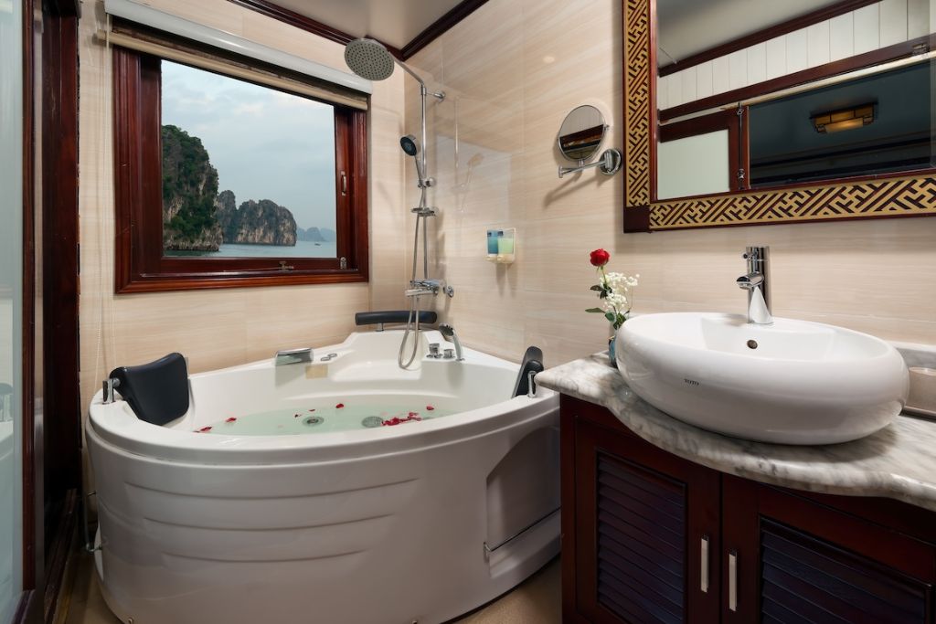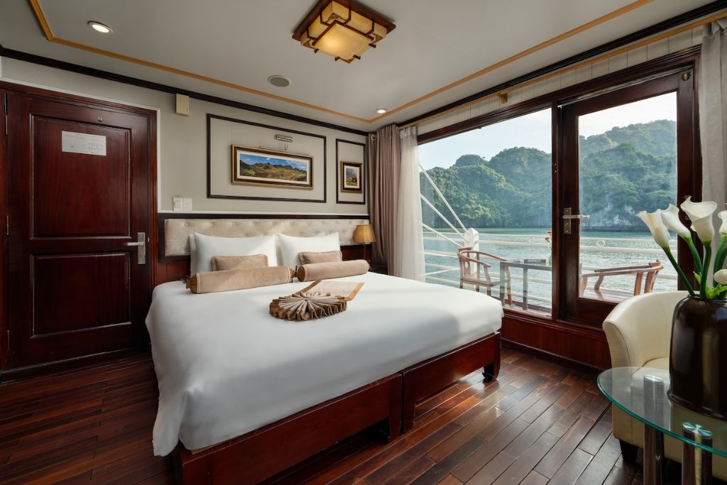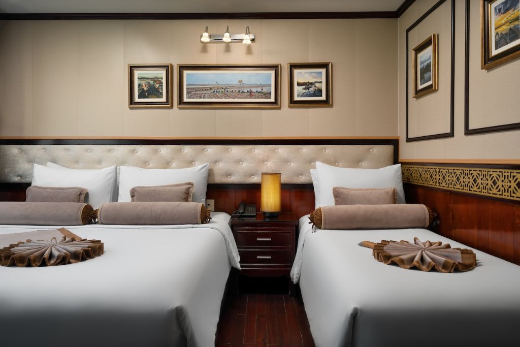 Swan is a metal boat which has 18 cabins decorated with oriental inspiration. It is the 3-star boat at a reasonable price among cruises in Bai Tu Long Bay. All the cabin are oriental-designed cabin with large windows. There are 3 cabins with balconies, family rooms with connecting doors, triple cabins. Certain cabin with Jacuzzi. On board the boat, there is an English-speaking guide.