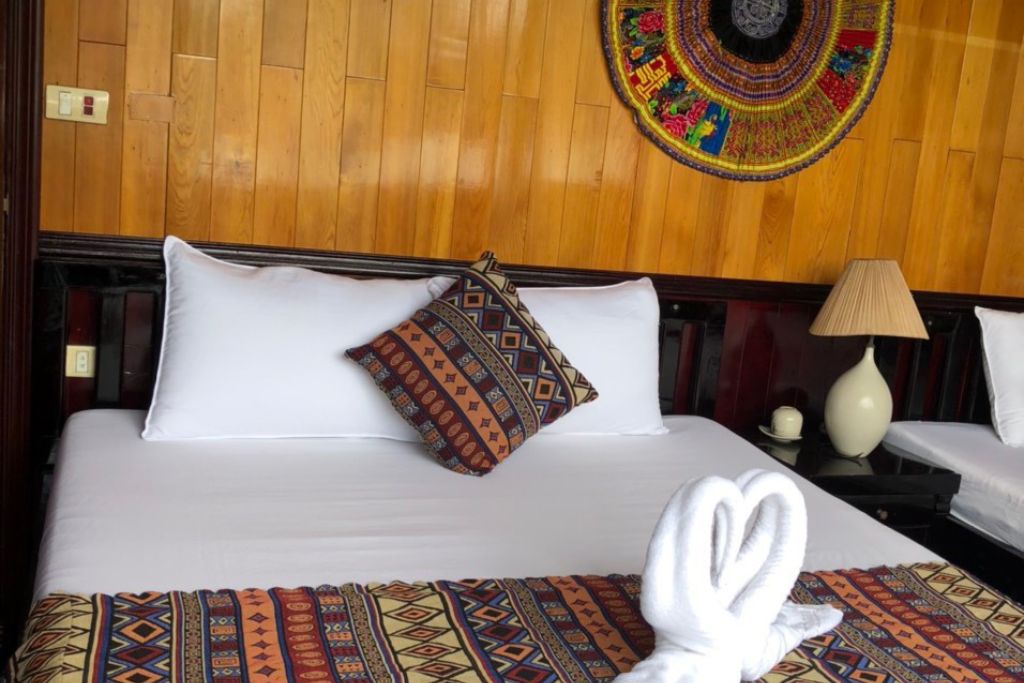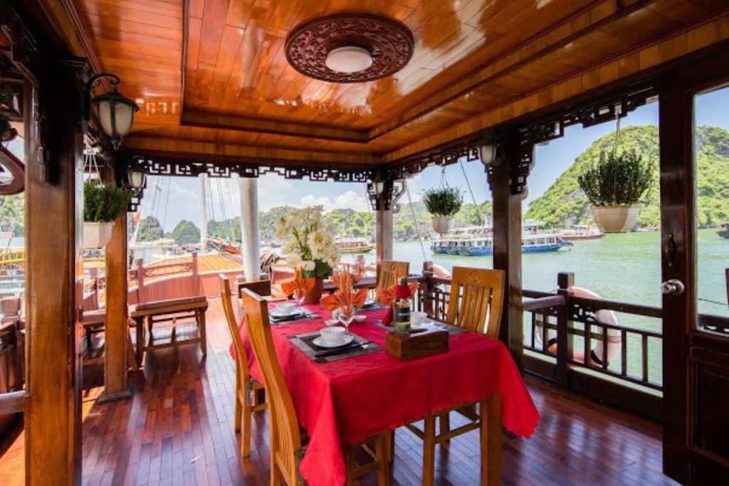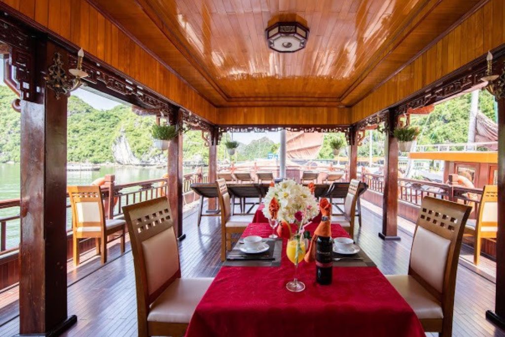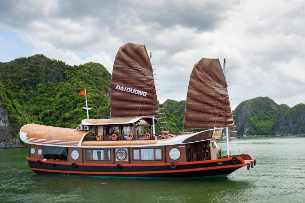 Cat Ba Ocean 08 is a metal boat that sails in Lan Ha Bay from Cat Ba Island, a less frequented route in Halong Bay. It is in the shape of an ancient ship with traditional Vietnamese style. The boat has 4 cabins with a large window.