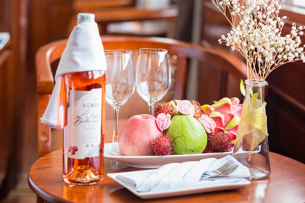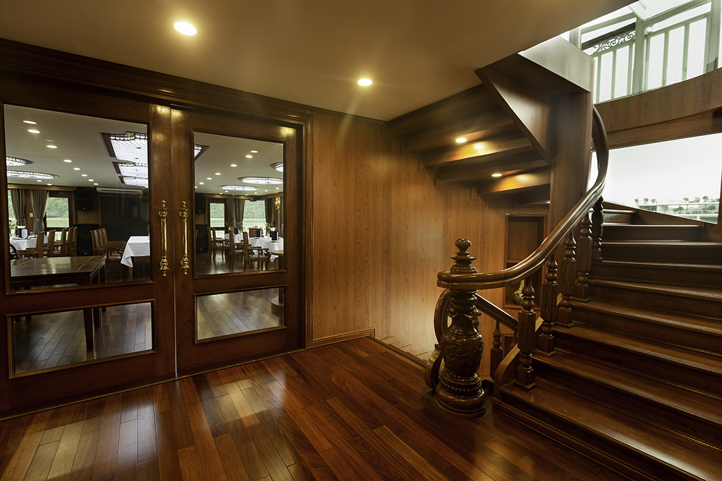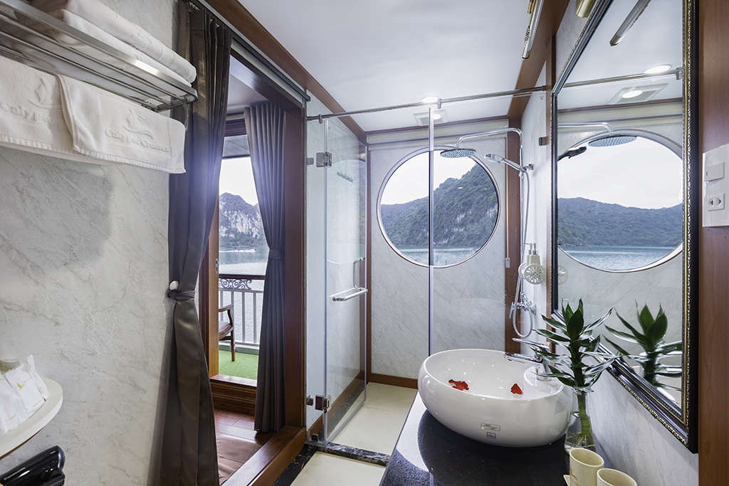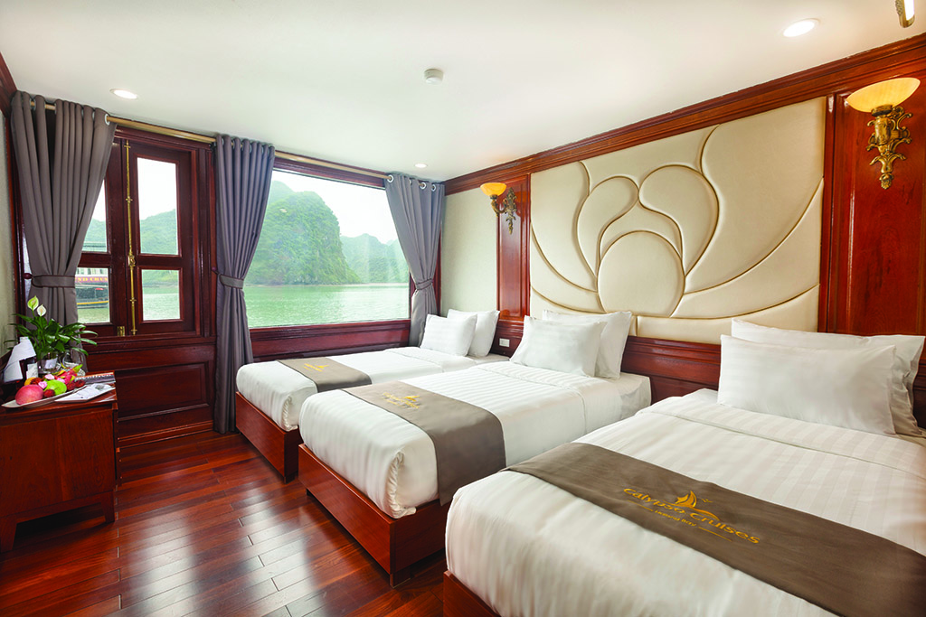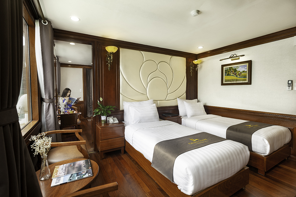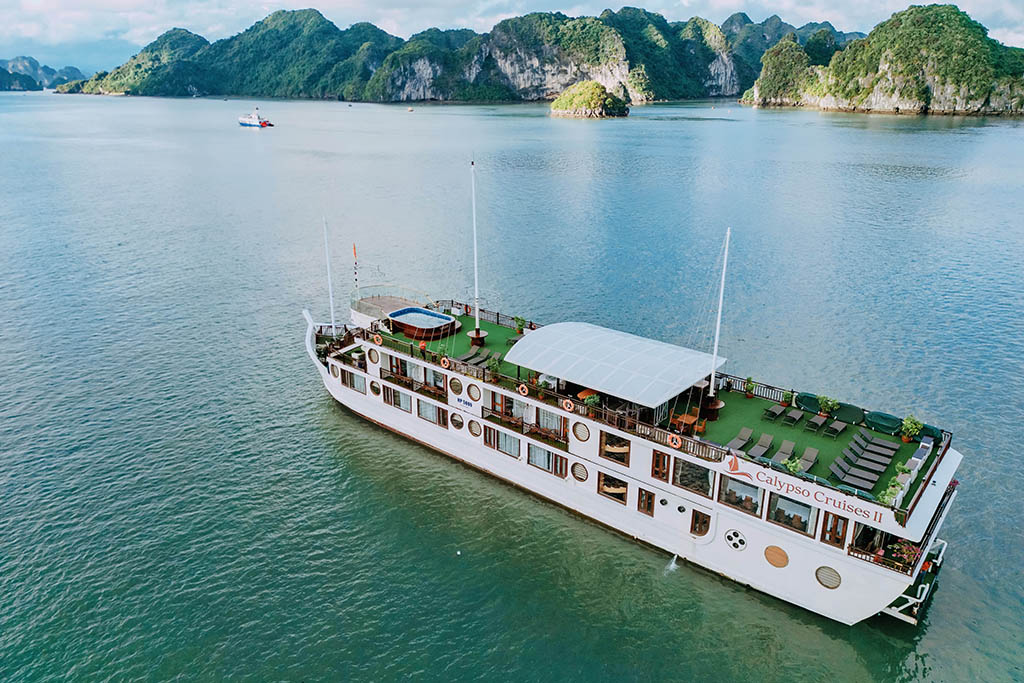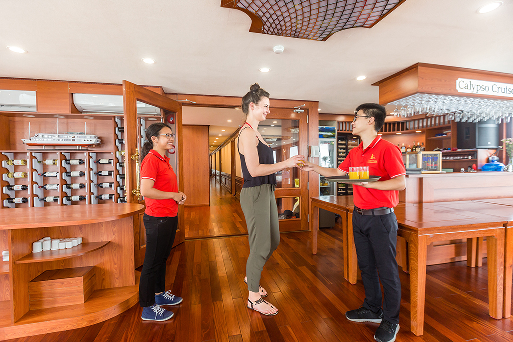 The Calypso Cruises, a steel boat with sturdy double bottoms, wears a white gown as the beauty of a goddess in her twenties, full of life energy. Each cruise consists of 20 luxury cabins, designed in classic Indochina style. All furniture is made from high-grade wood with deep brown color creating a warm, close to nature atmosphere. Rooms are well-equipped with modern amenities and large windows with beautiful views of the bay. With a capacity of 50 guests, the Calypso Cruises create a cozy and fun space. The highlight of the cruise is three white masts. Looking from a far distance, three masts stand out to the sea to take the ship glide on the green channel, make the guests feel secure and fully enjoy the exciting visit of Lan Ha.