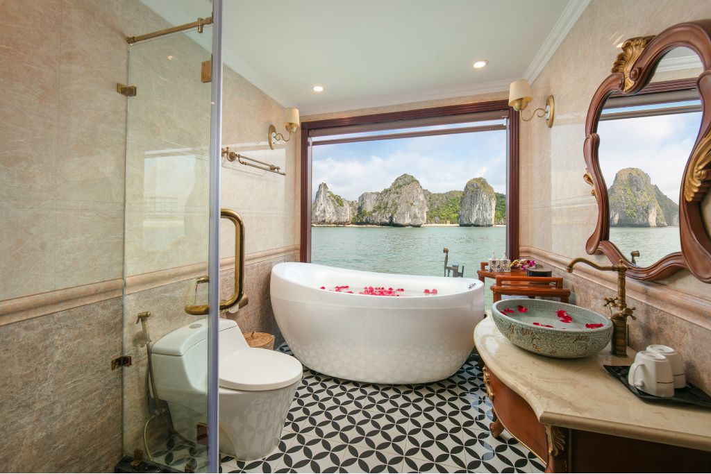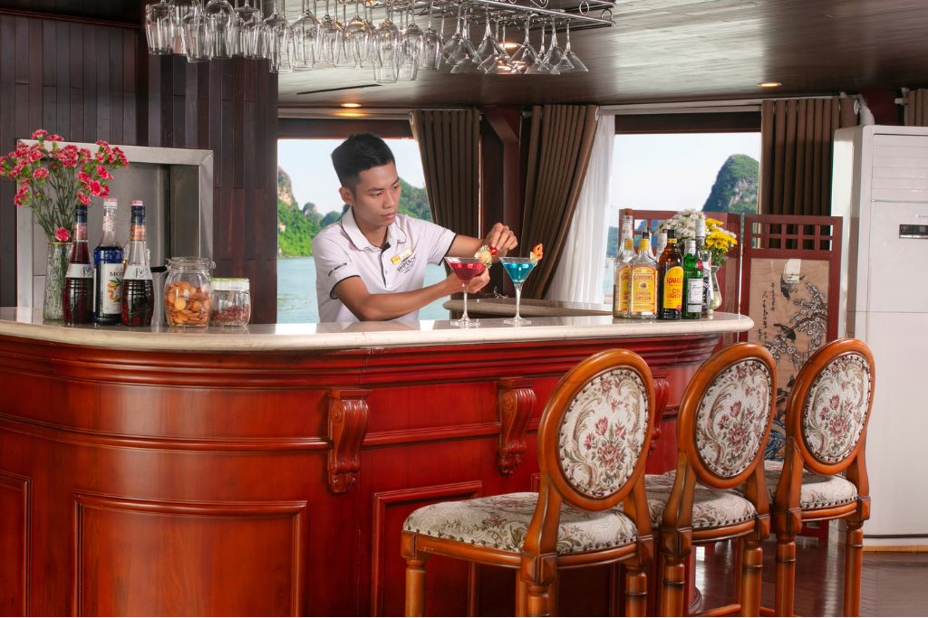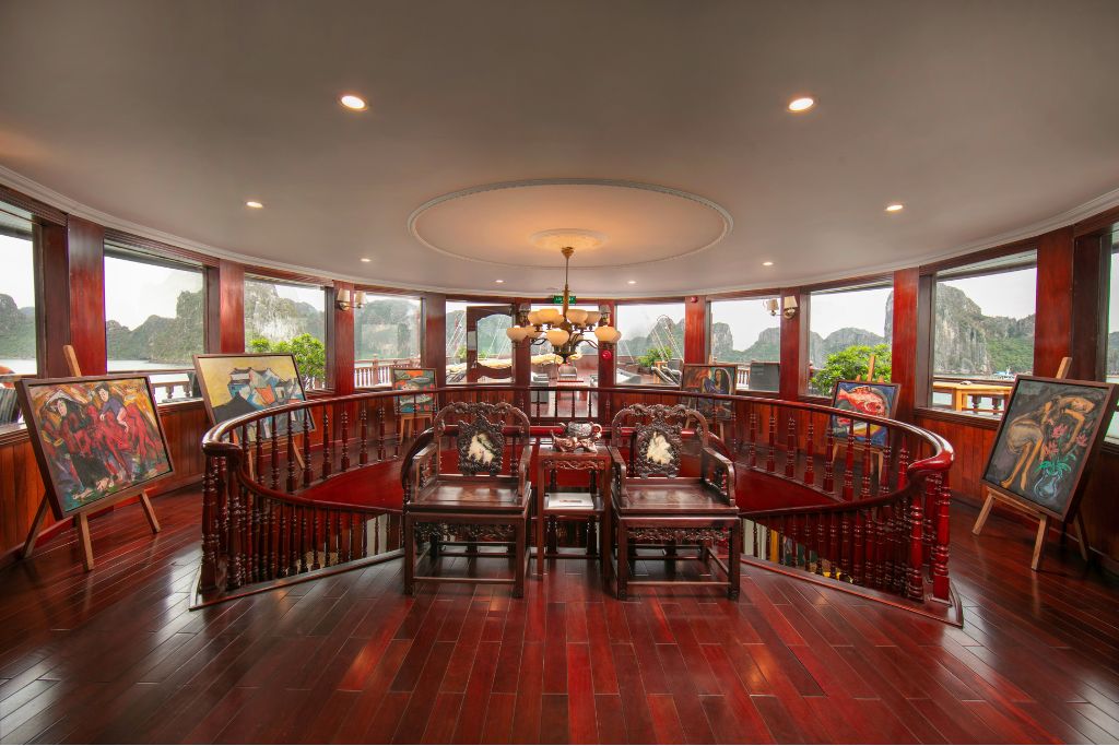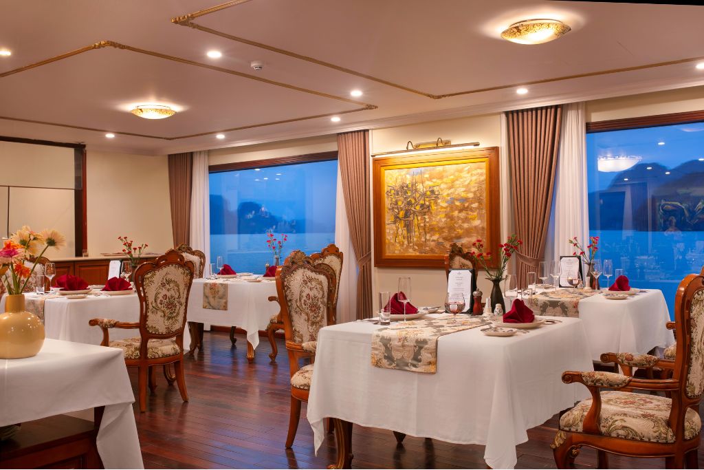 La croisière Emperor est un bateau luxueux de 10 cabines avec 3 ponts qui propose la croisière en Baie d’Halong. Inspirée par la vie somptueuse de l’Empereur de Bao Dai, le dernier roi du Vietnam, le bateau Emperor est conçu dans le style royal classique des années 1930 avec des équipements modernes. Chaque cabine dispose d’une histoire et d’un design spécifique en optimisant le confort et la lumière naturelle. Une grande terrasse au pont supérieur, deux bars, deux restaurants de luxe, une petite bibliothèque, une salle de sport, un coin pour enfants sont mis à votre disposition. Il y a le guide anglophone à bord du bateau. L’équipage est sympathique. Le wifi gratuit.