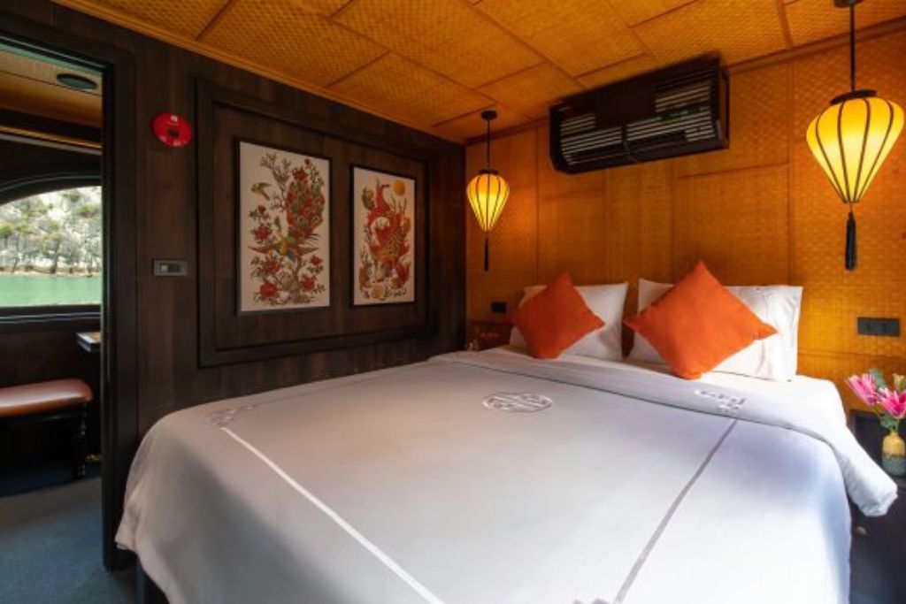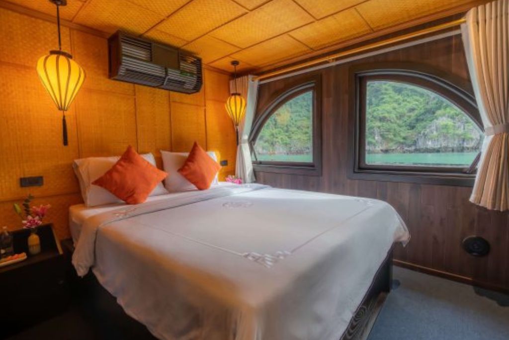 La croisière privée d’Amour une cabine est un bateau traditionnel en bois conçu avec sophistication avec 2 voiles. Cette jonque est décorée de façon traditionnelle avec une attention minutieuse à chaque détail. Il n’y a pas de lit d’appoint. Les cabines n’ont pas de balcon, par contre, vous pouvez admirer la baie de Bai Tu Long grâce à une grande fenêtre vitrée.