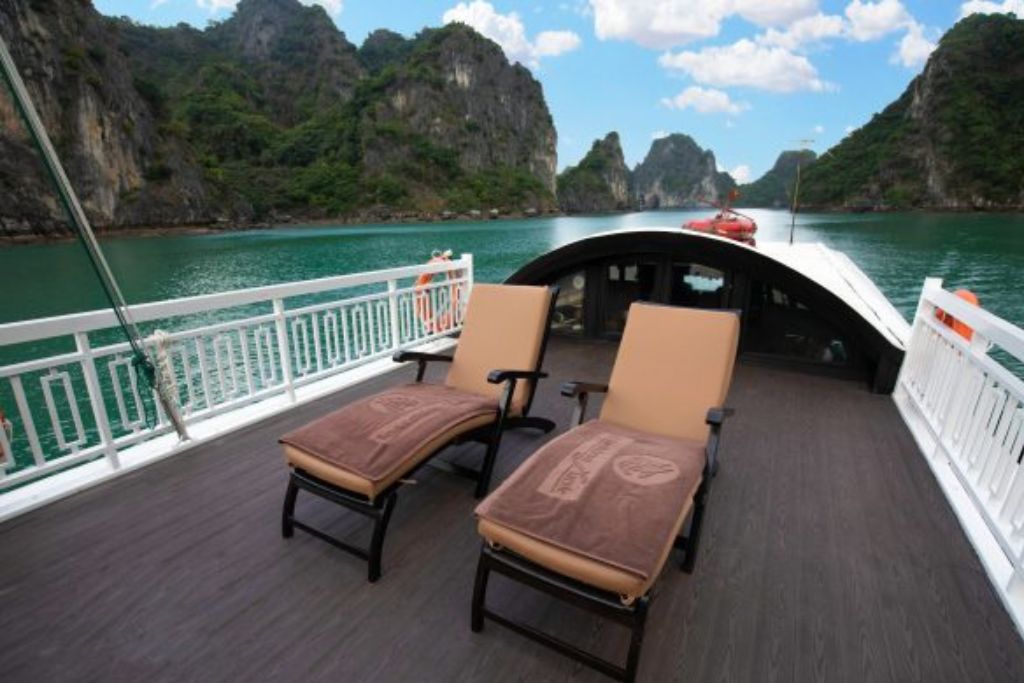 La terrasse est équipée des chaises longues, idéalement pour la détente et la vue panoramique exceptionnelle sur les beaux paysages de la Baie de Bai Tu Long.