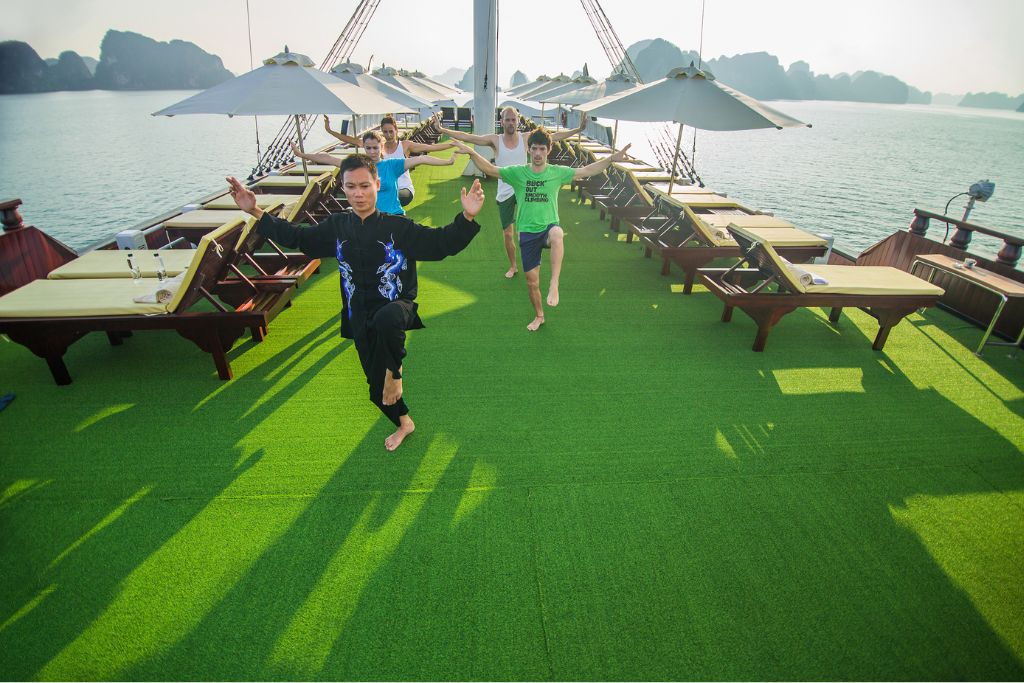 Le bateau possède une grande terrasse pont soleil qui offre une vue panoramique exceptionnelle sur les beaux paysages de la Baie de Bai Tu Long tout au long de votre croisière. Des chaises longues sont à votre disposition. L'exercice de Tai Chi matinal y est proposé.