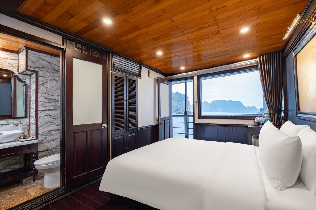 Le bateau possède un pont soleil qui offre une vue panoramique exceptionnelle sur les beaux paysages de la Baie de Bai Tu Long tout en dégustant un cocktail (Supplément). Des chaises longues et des tables sont à votre disposition. Il y a un bar sur ce pont de soleil.