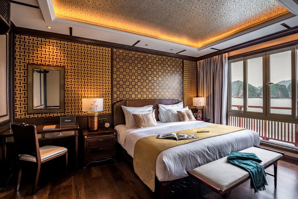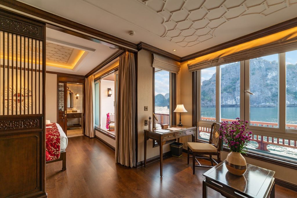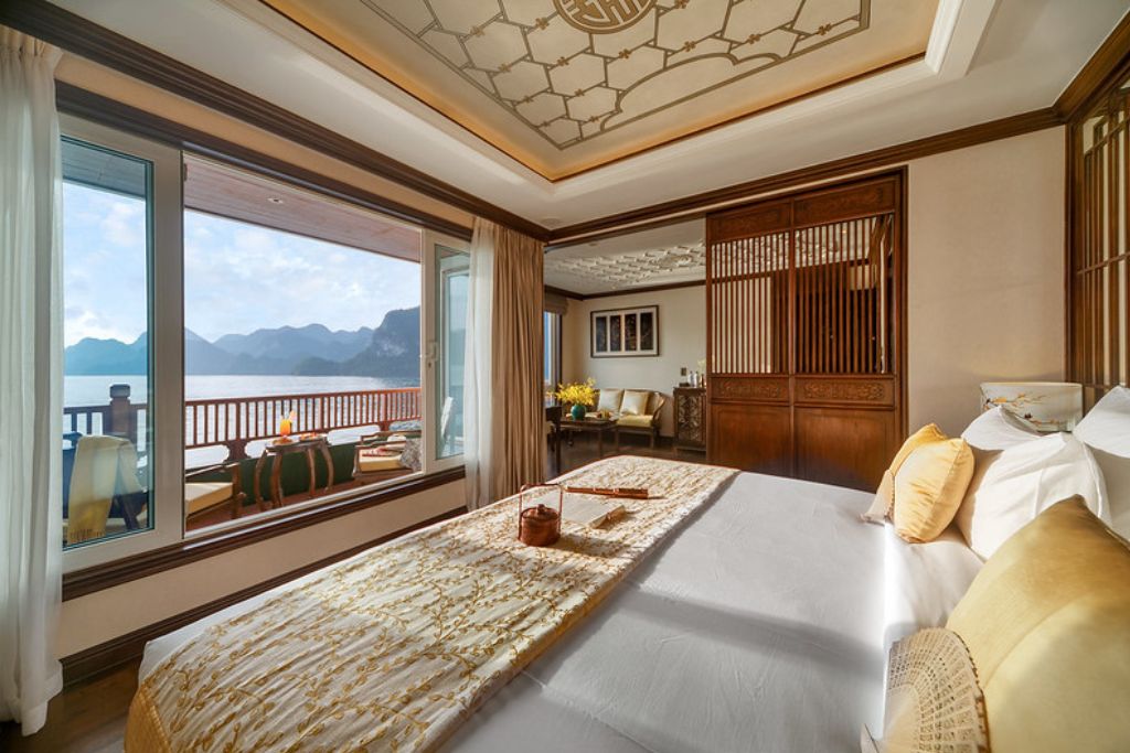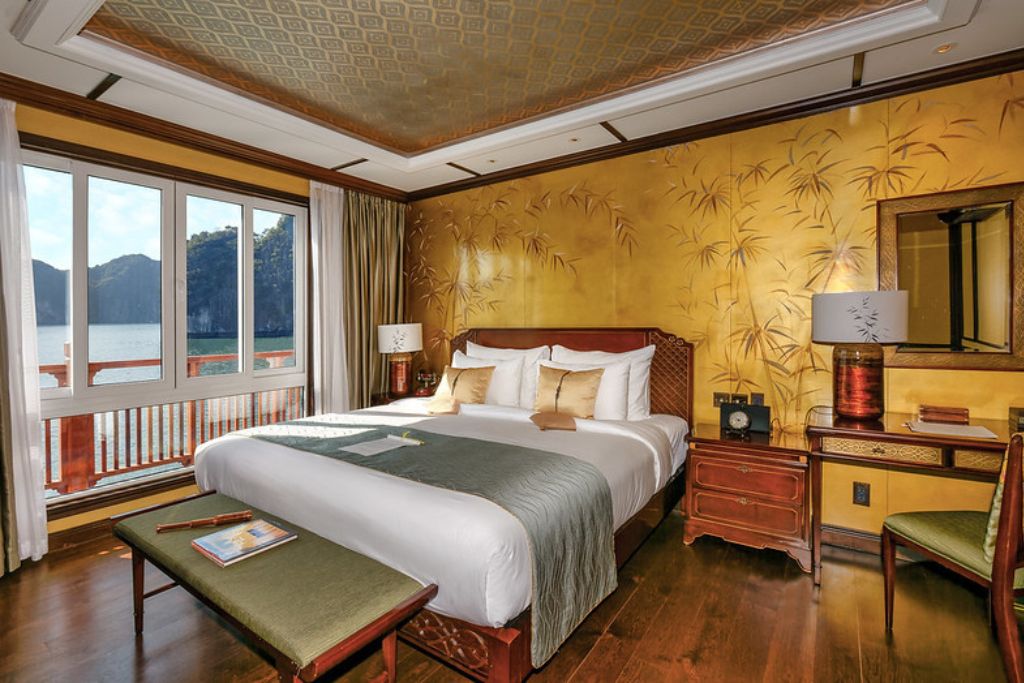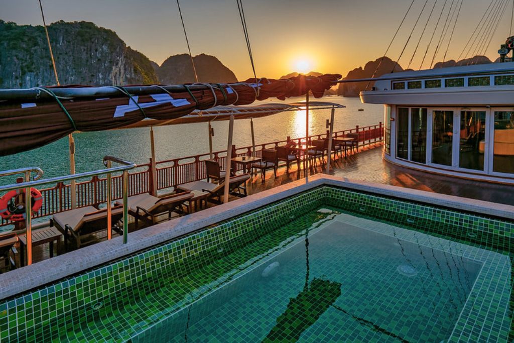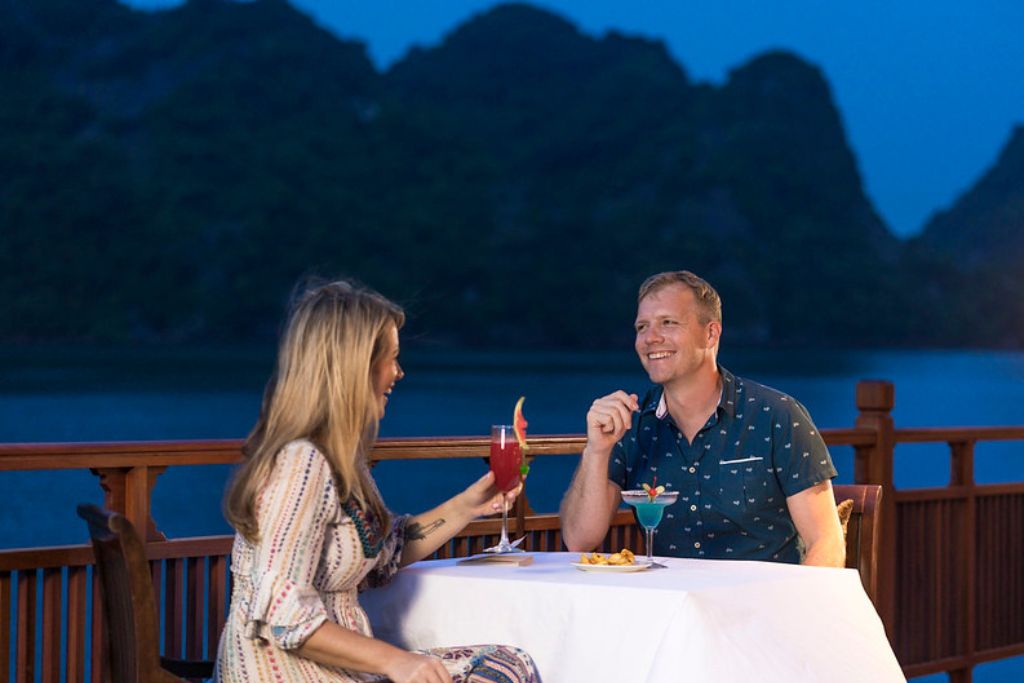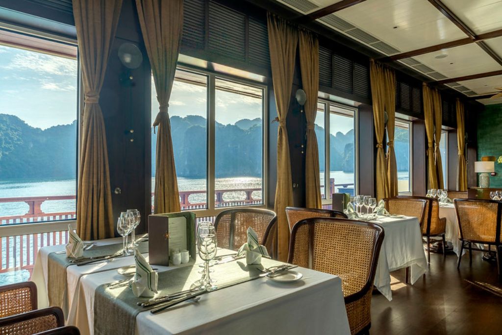 Le restaurant du bateau est un paradis culinaire où une gamme variée de plats vietnamiens frais est servie dans un somptueux restaurant doté d’une façade vitrée à presque 360 degré offrant aux convives une magnifique vue sur la Baie de Lan Ha. Les clients peuvent savourer la nourriture copieuse et sa cuite à la perfection tout en s’immergeant dans un paysage époustouflant.