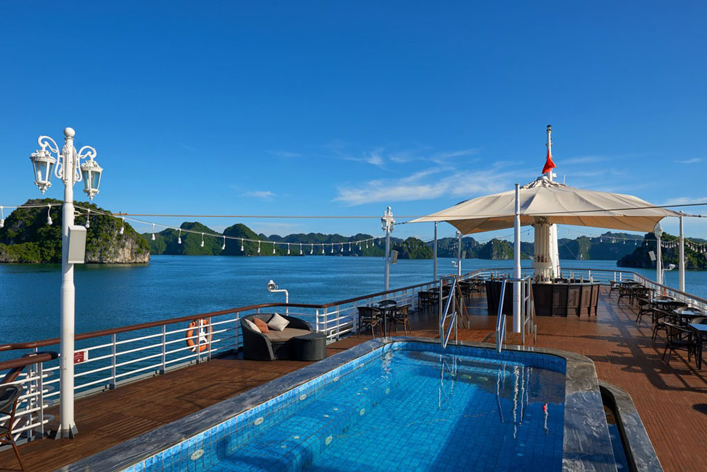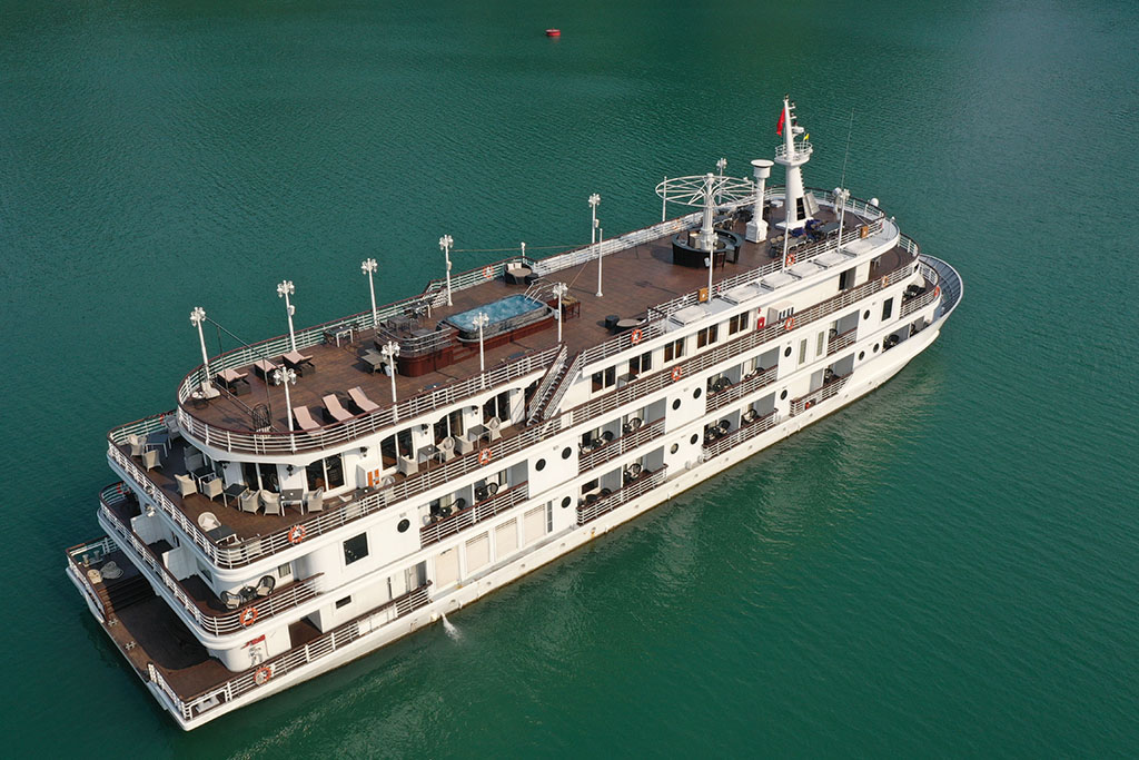 Un bateau de luxe 5 étoiles dans la baie d’Halong, offrant des services de bien-être haut de gamme : piano-bar, musique live, piscine jacuzzi, etc.