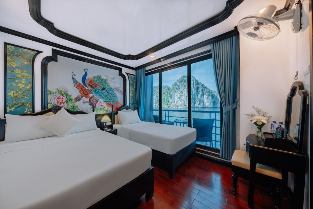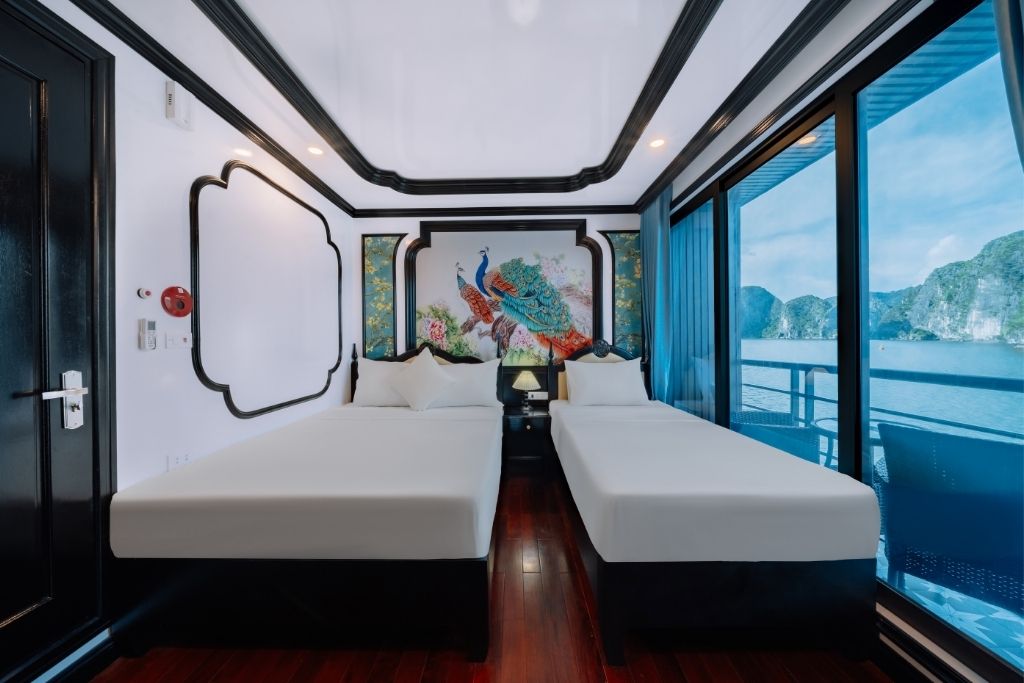 Nouveau bateau lancée en Septembre 2025. 10 cabins avec large fenêres. Bateau en acier qui navigue en Baie de Lan Ha à partir de l’île de Cat Ba.