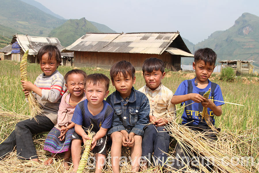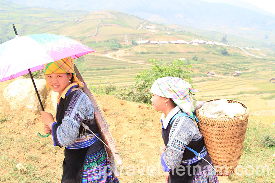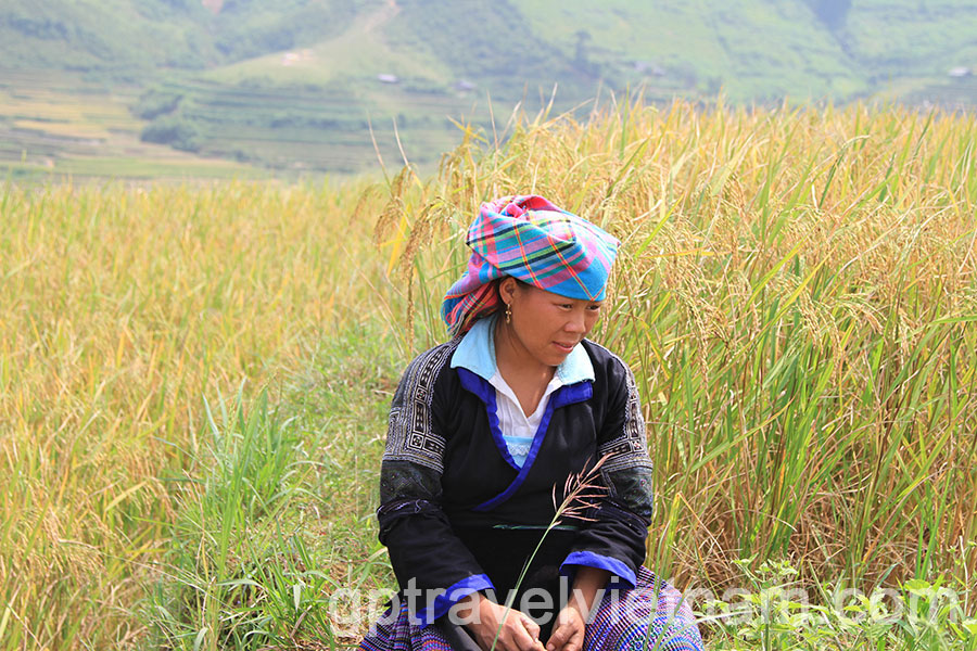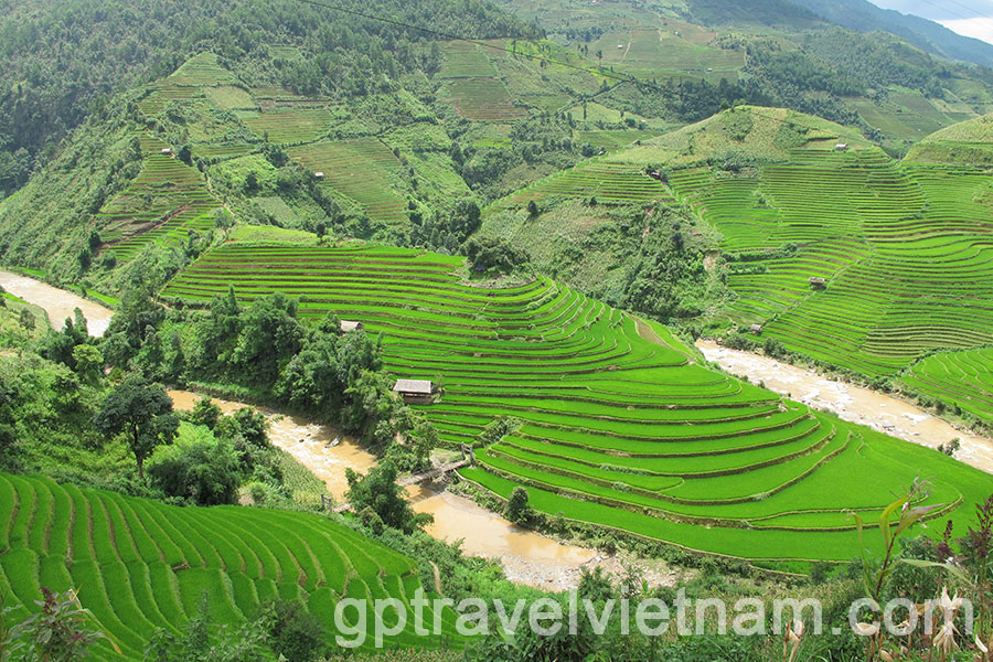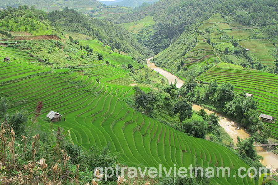 Vous aurez aussi la possibilité d’assister à un spectacle de chants et de danses folkloriques. Ensuite, vous quitterez Cat Cat pour marcher en direction de la vallée des Muong Hoa pour y découvrir de très belles rizières en terrasse (Rizières en eaux et parsemés des jeunes riz en Avril, vertes entre Mai et Juillet ; jaunes entre Août et avant 15 Septembre, non cultivées entre Octobre et Mars).