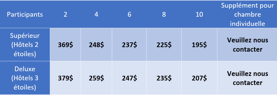 Vous pouvez combiner ce programme avec un autre voyage en groupe ouvert et ainsi construire un voyage fantastique à un prix très intéressant! Vous pouvez aussi choisir de prolongez votre séjour avec un circuit privé.